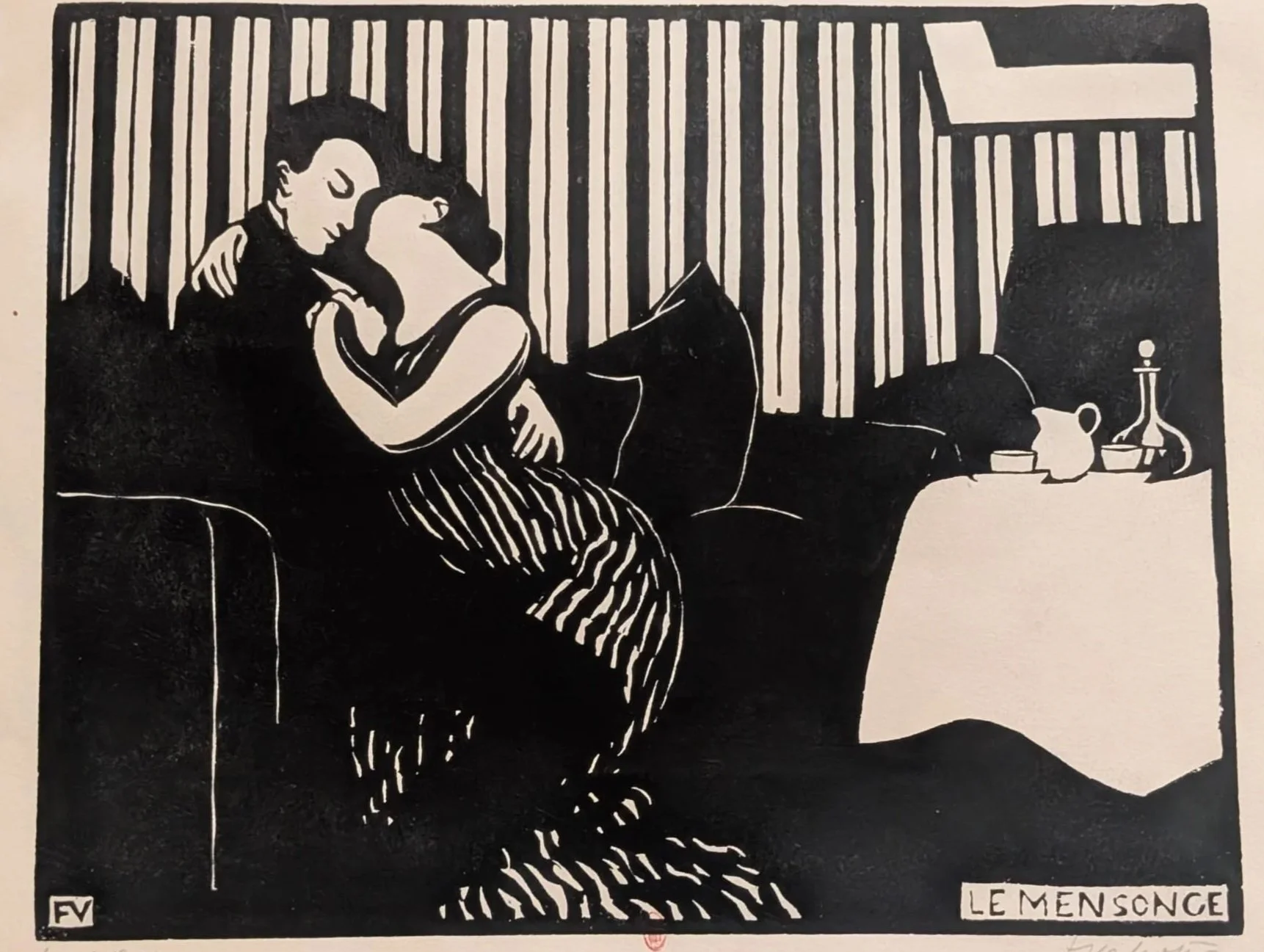 Parmi les séries d’estampes exposées, celle qui nous a particulièrement touchée est celle confiée à Felix Vallotton pour la Revue blanche : Intimités une série de 10 gravures sur bois de 1898.