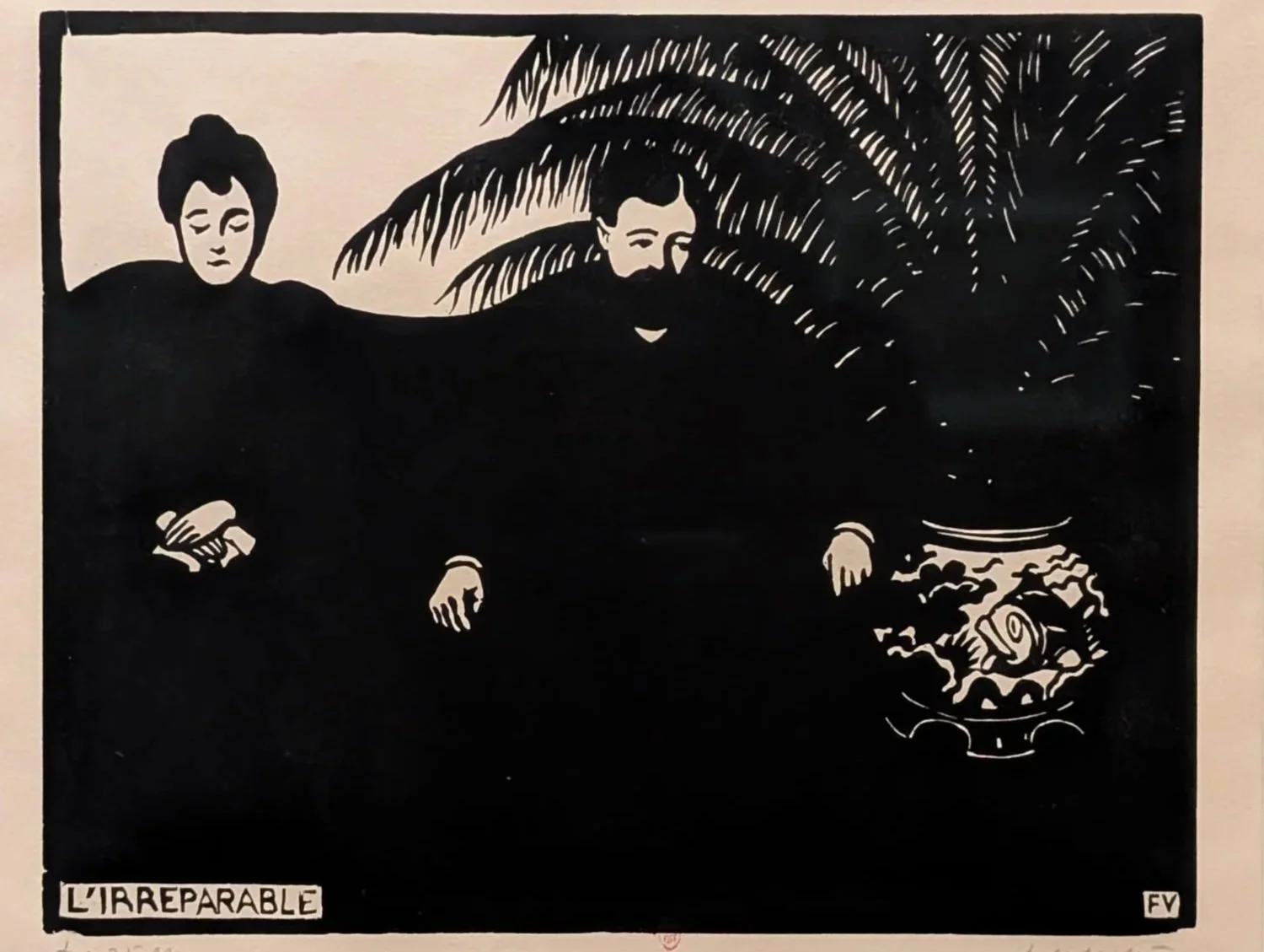 À travers de puissants aplats noir et blanc intense, Vallotton nous raconte les spectacles de l’intime et les drames silencieux de la vie bourgeoise. Des scènes de couple dans des intérieurs feutrés révèlent sous un regard presque satirique les séparations et les tensions muettes. La gravure sur bois, dans toute sa simplicité restitue toute l’intensité émotionnelle de ces instants suspendues. Même en absence de couleurs, dans une épuration des formes, Vallotton retranscrit avec exactitude des ambiances et des sentiments, un talent que l’artiste démontre avec modestie !
