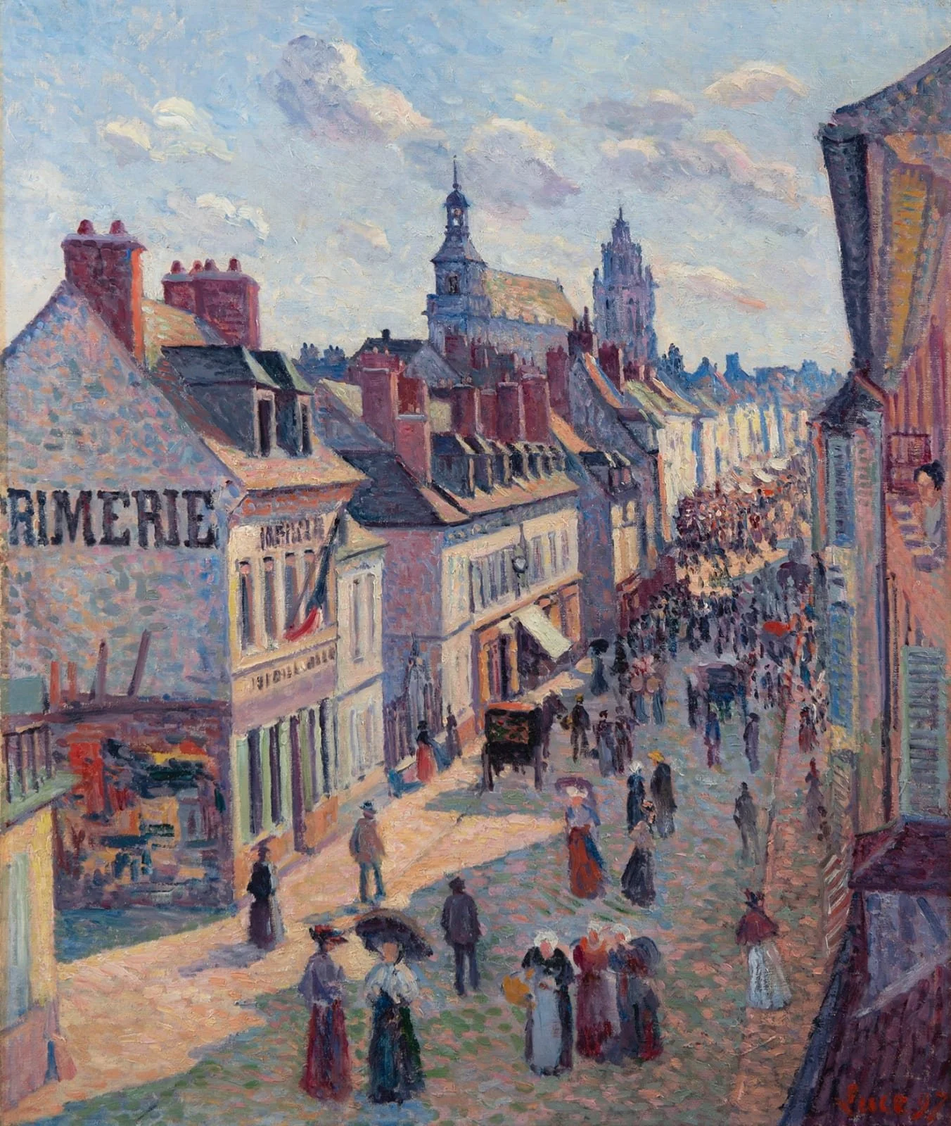 Dans l’oeuvre exposée Jour de marché à Gisors de 1897, Luce représente l’effervescence d’un marché dans l’Eure, par une foule animée vue en hauteur. On retrouve sa touche minutieuse pointilliste et cette atmosphère de teinte violette caractéristique de travail. Ces nuances uniques de violet reviennent dans la majorité des œuvres exposées, sans redondance. On remarque également dans cette oeuvre l’attention portée à la typographie des devantures et aux affiches publicitaire : Luce, le progressiste, aime représenter tout ce qui incarne cette nouvelle société capitaliste en essor à la fin du siècle.